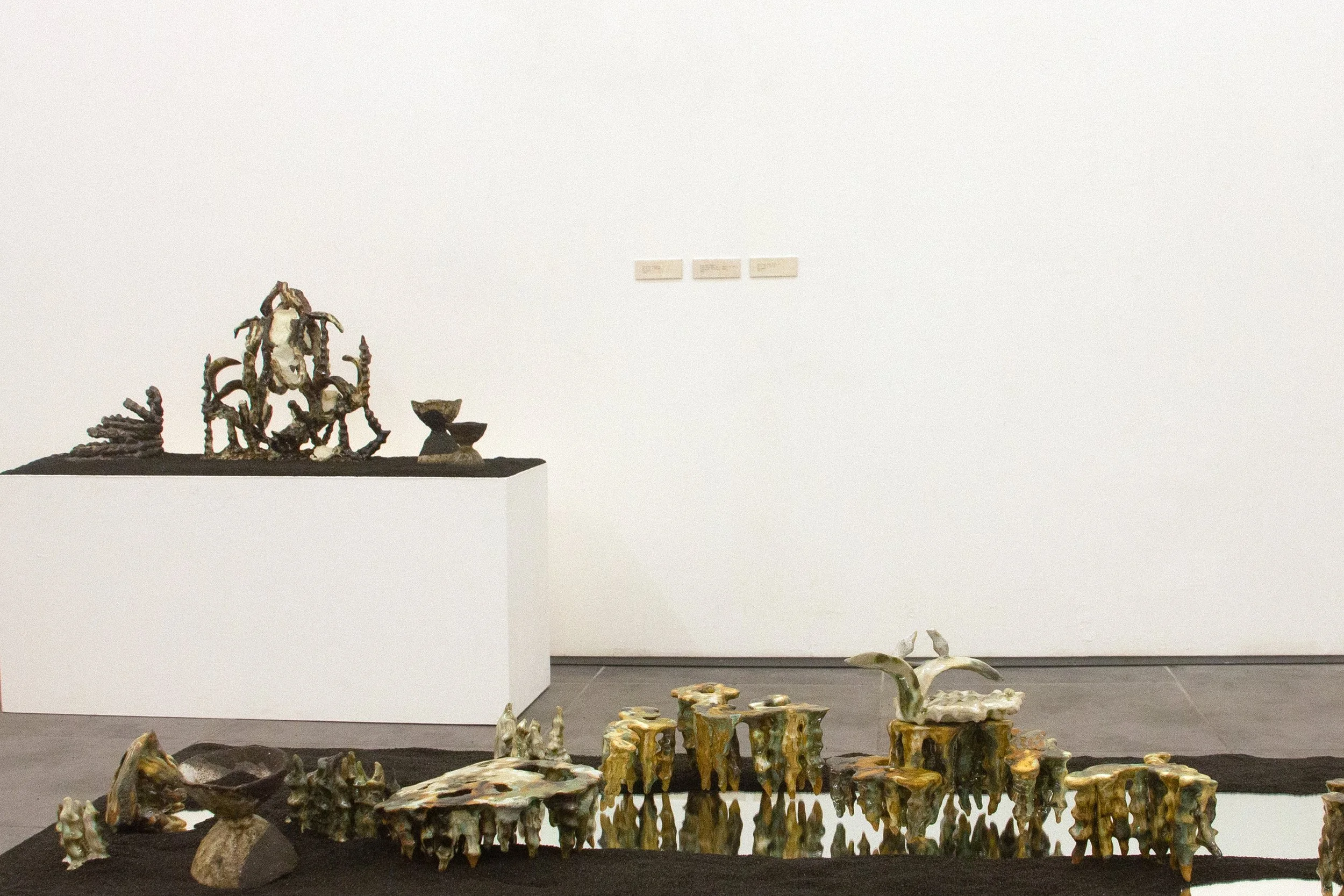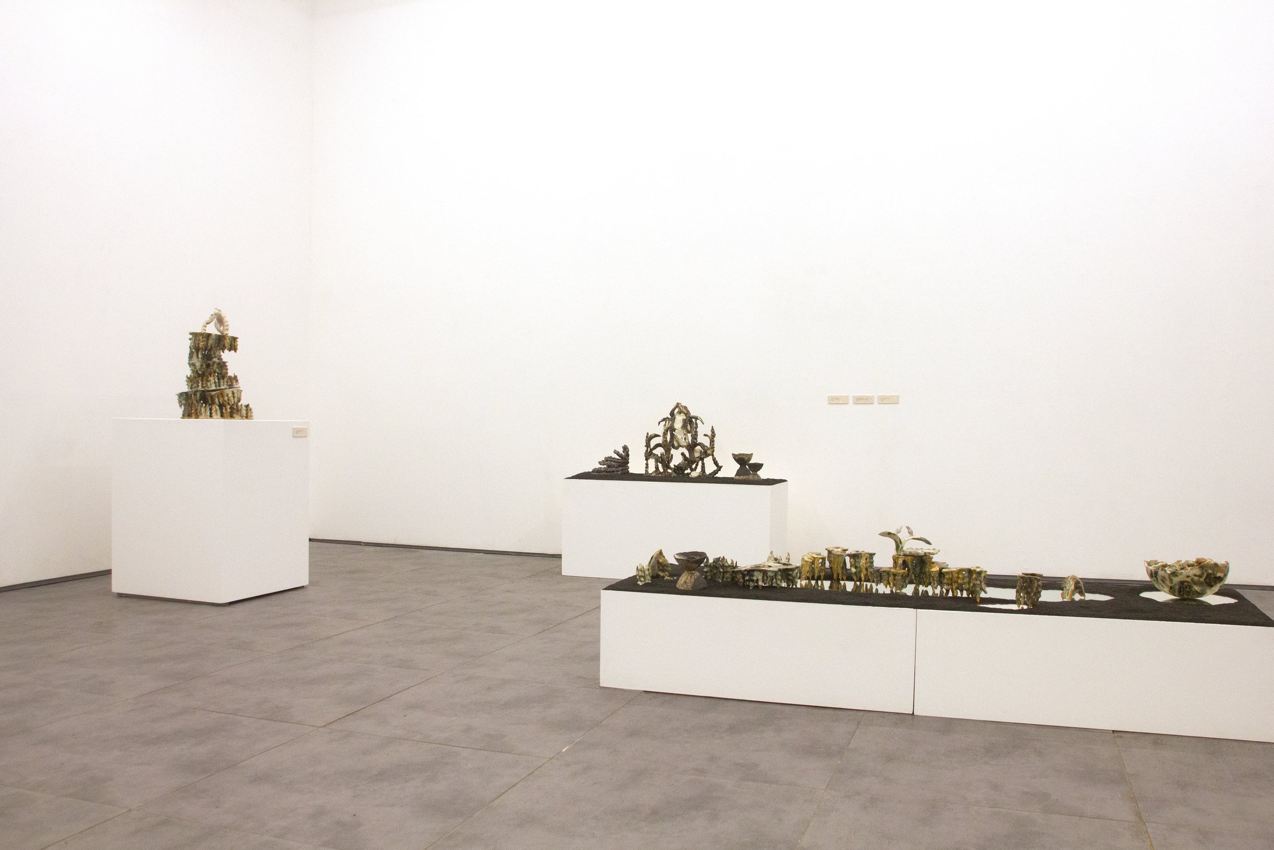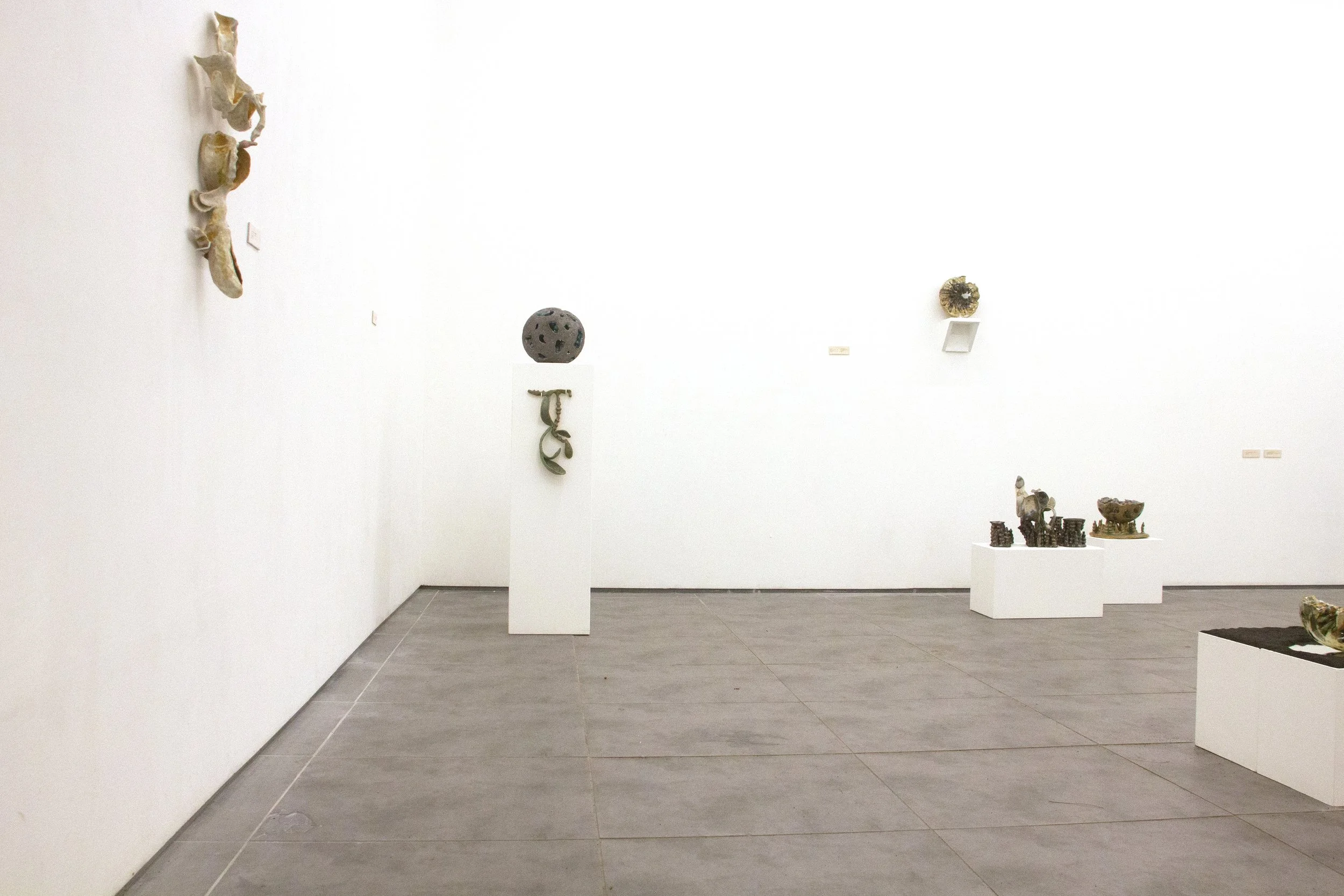 The exhibition Dearly Impossible starts with the understanding of the sublime as a combination of awe and terror. Contradiction characterizes this notion, and the ceramic sculptures in this room particularly examine the contrast of attraction and repulsion, as well as the subsequent effect of intensification. They are a visual allegory of the sublime identity of human experience. The title of the show is based on a moment of parapraxis, a Freudian slip. It highlights the impotence and inadequation (unangemessenheit*) of language to grasp the totality of consciousness. This body of work demonstrates awe as a feeling of uneasy appreciation for beauty and the systems of the world around us.